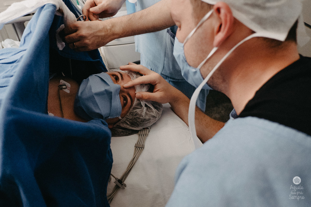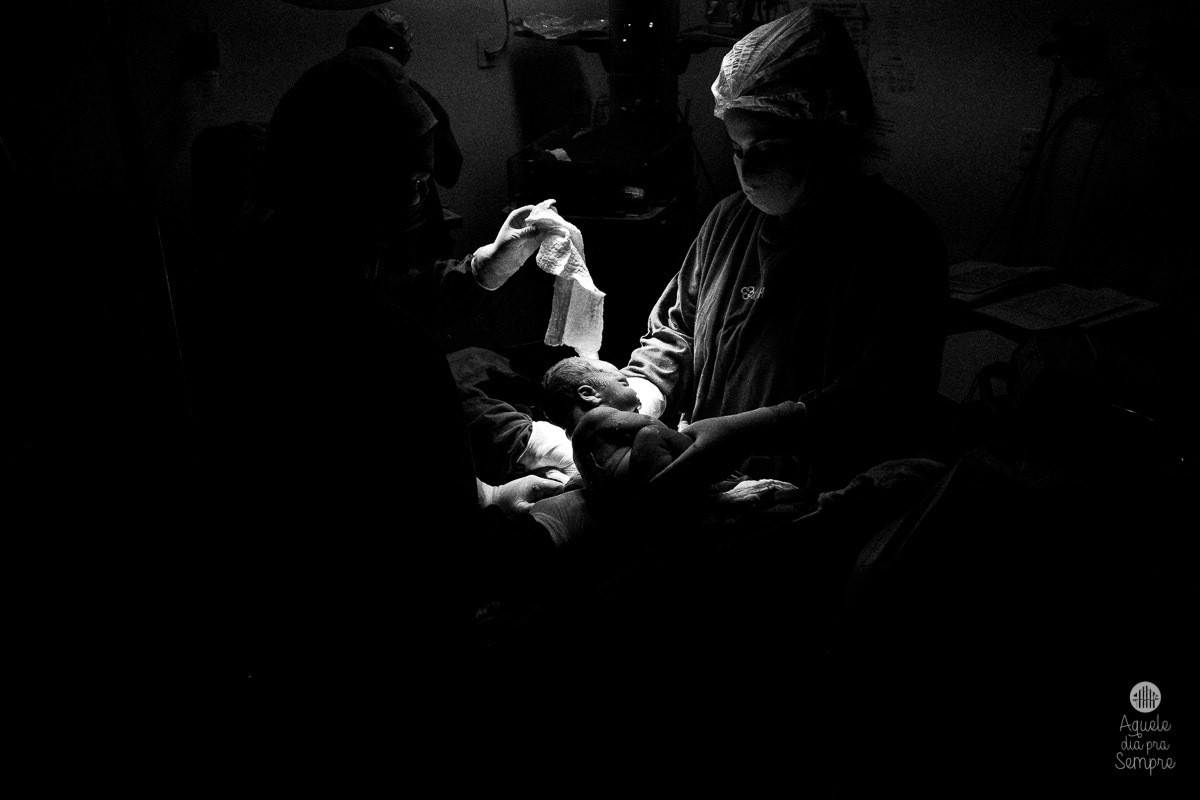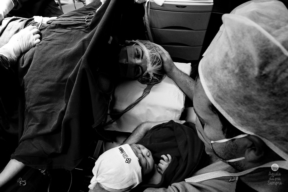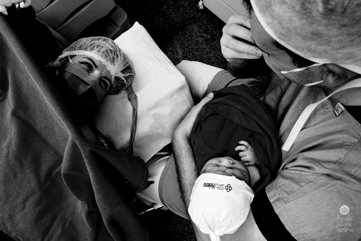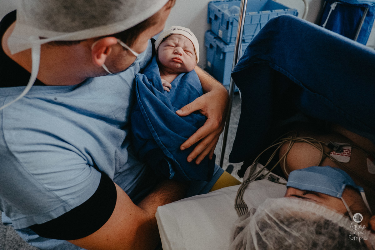 Então, era hora: o parto. Os primeiros momentos necessitaram cuidado e atenção para que logo Guto estivesse juntinho de Thuani e Jonatas, sentindo o calor do corpo da mamãe e o carinho da mão do papai. Rápido, intenso e emocionante, assim foi o parto do Guto.
