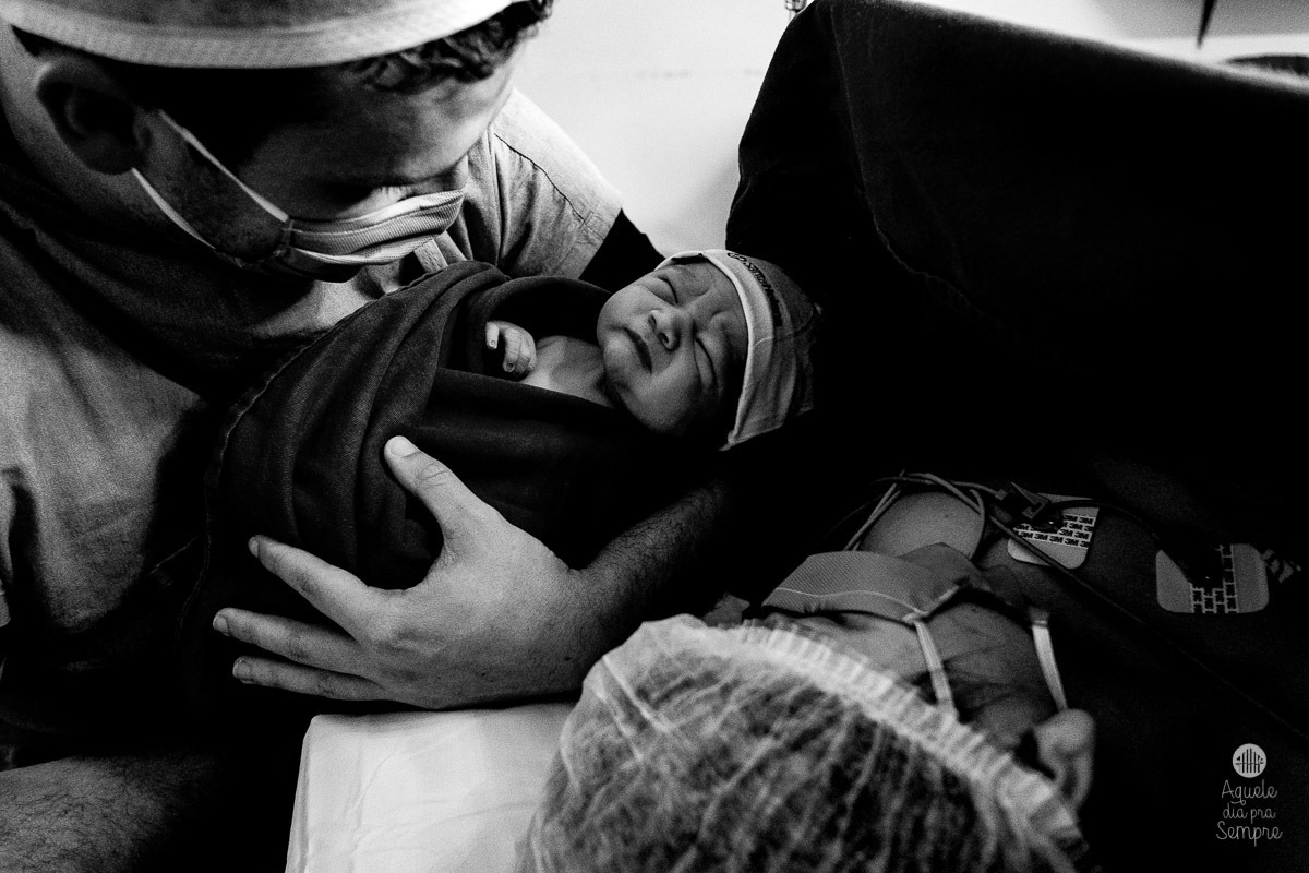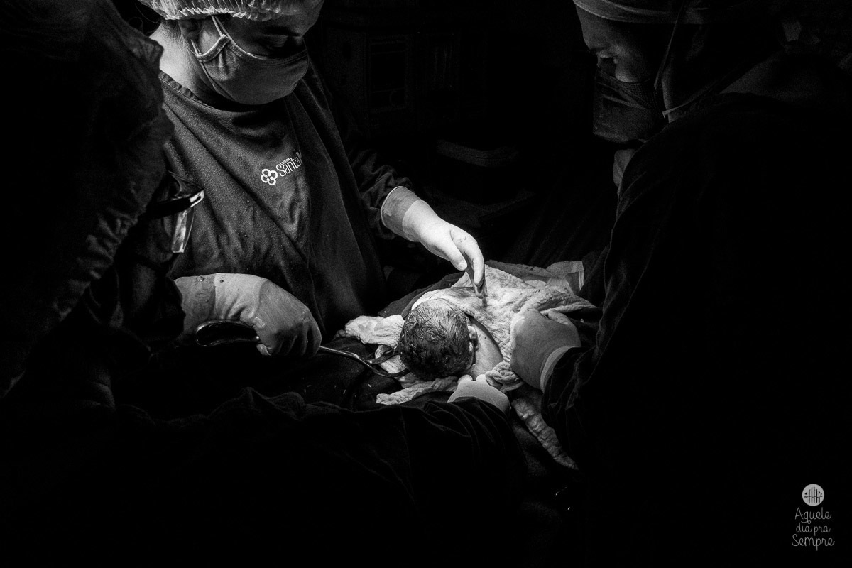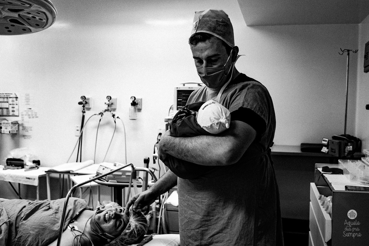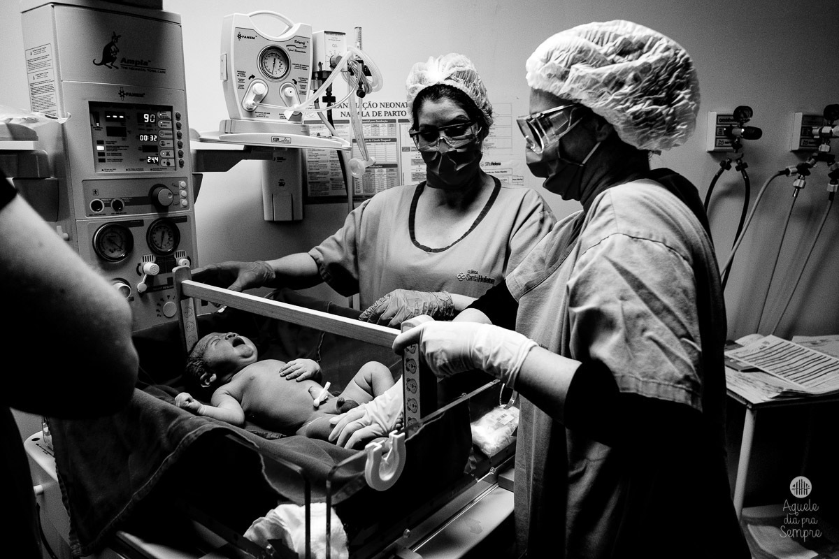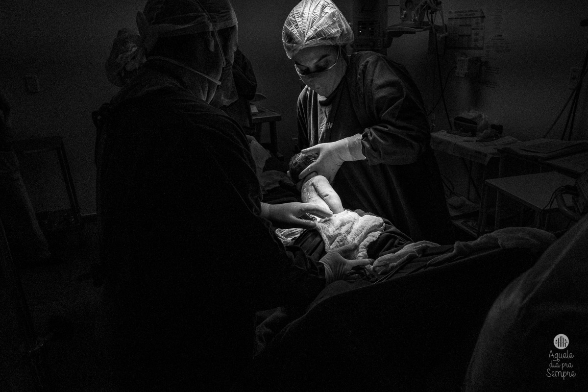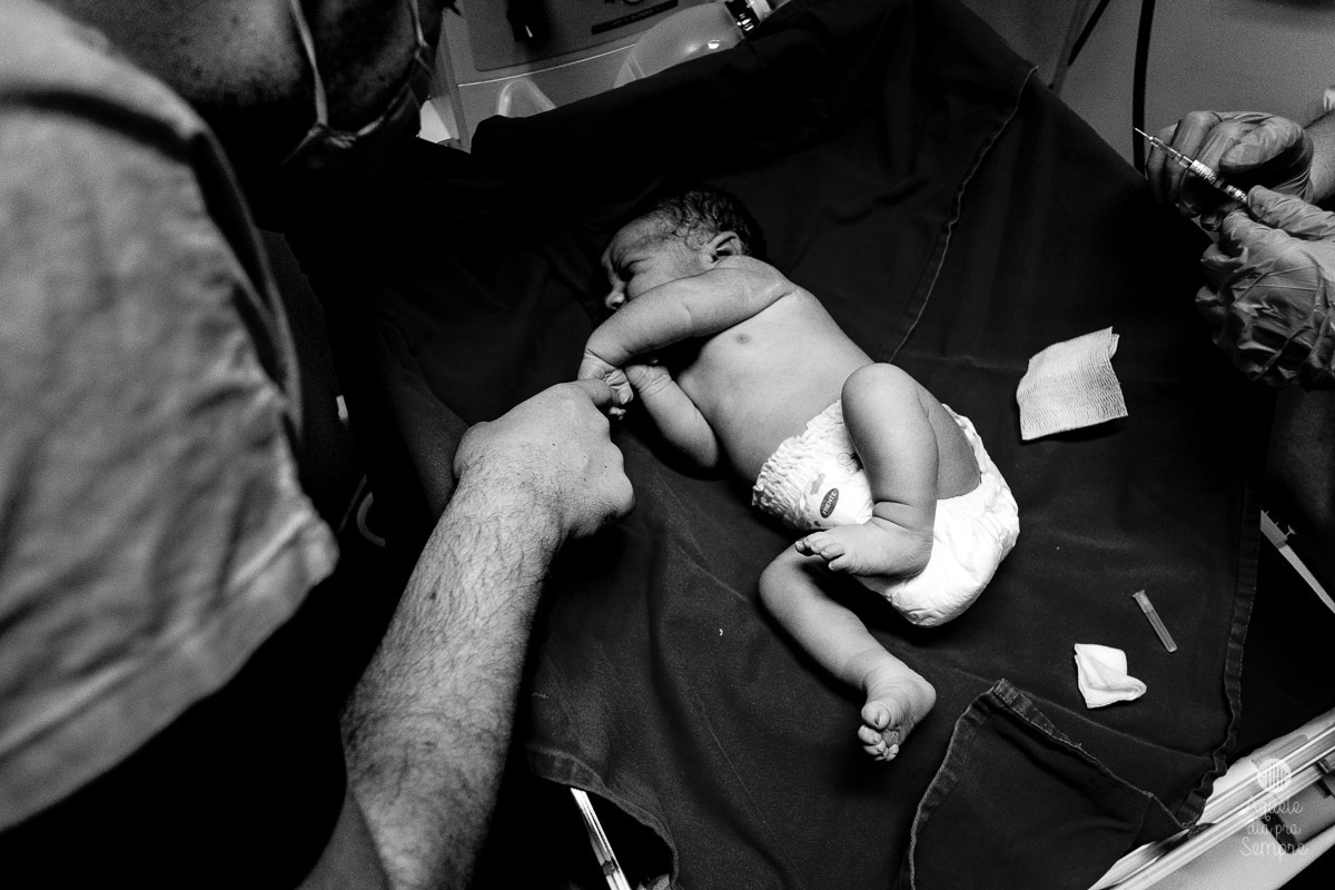 Então, era hora: o parto. Os primeiros momentos necessitaram cuidado e atenção para que logo Guto estivesse juntinho de Thuani e Jonatas, sentindo o calor do corpo da mamãe e o carinho da mão do papai. Rápido, intenso e emocionante, assim foi o parto do Guto.