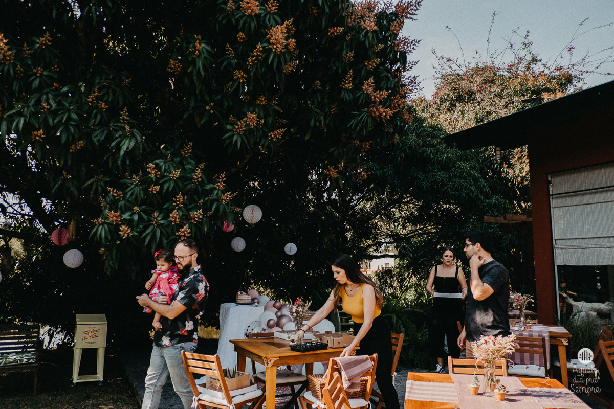 Em um lugar lindo perto da natureza, ao ar livre, acompanhamos a mamãe Mayana e o papai Volnei organizando os últimos preparativos para receber os avós, tios, dindos e irmãos. Em cada detalhe registramos o cuidado e dedicação da família para esse momento. Enquanto isso, Luiza curtia o colo dos dindos e das dindas.